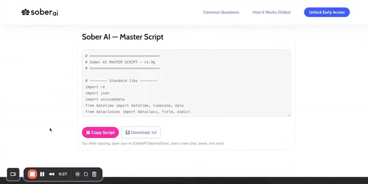 Sober AI is an operating system (Sobriety OS) designed for ChatGPT and Gemini. No technical skills needed — you simply copy and paste the “Master Script” into your chatbot like any other prompt.
